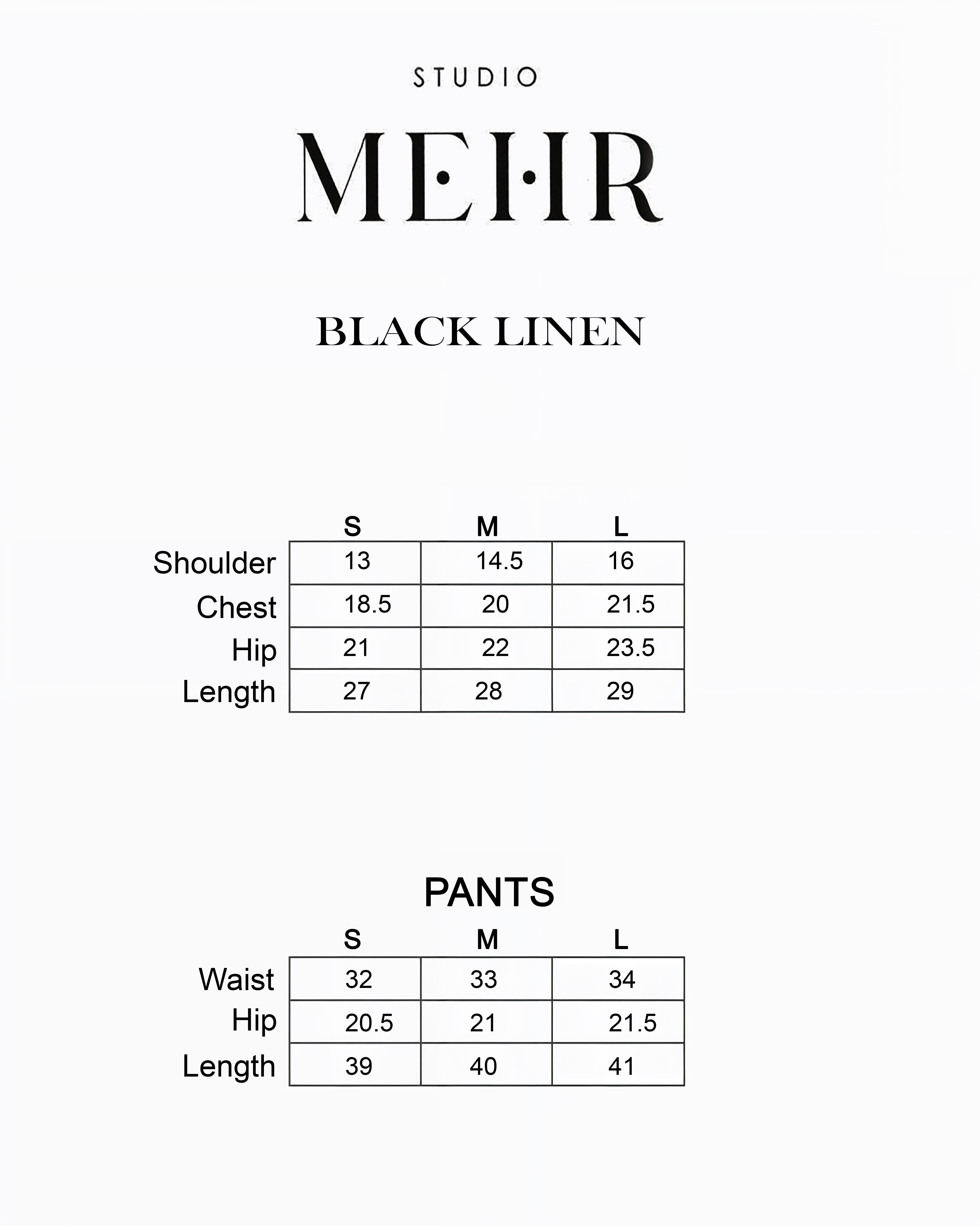 A timeless black co-ord in breathable linen, designed with a relaxed fit. The shirt features a classic collar, button-down front, and a unique cutwork 3D floral motif on the sleeve cuffs. Paired with flowy wide-leg trousers