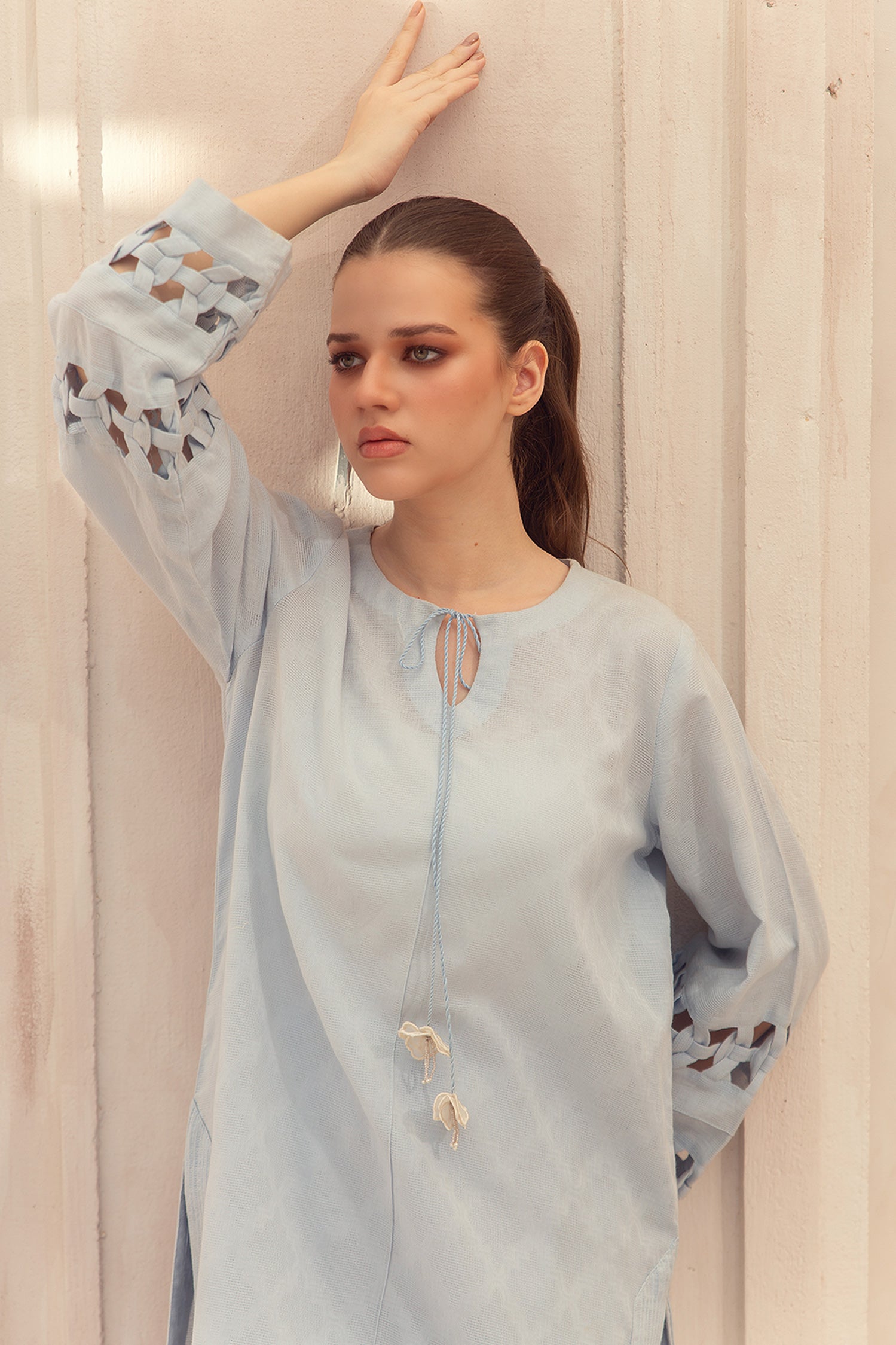 This set features a breezy powder blue shirt with delicate cutwork sleeves, a keyhole neckline with tassel details, and pintuck accents for a refined touch. Paired with wide-legged, straight-fit pants.