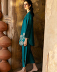 Drenched in a deep teal hue, this luxurious ensemble features a tunic with intricate cutwork embroidery along the scalloped hemline, adorned with delicate floral motifs that exude timeless charm. The refined neckline and sleeves echo the same meticulous craftsmanship, offering a seamless blend of tradition and modernity. Paired with tailored culottes with subtle embroidered detailing, this set embodies understated opulence—perfect for this festive season. The set comes with a matching slip.