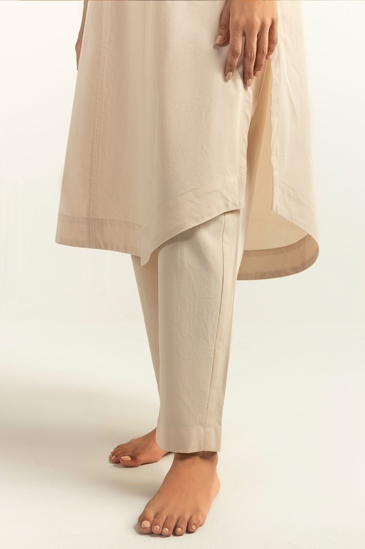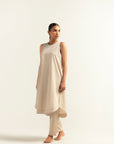 A sleeveless beige set with a flowy, high-low hem shirt and straight pants. Simple, lightweight, and easy for everyday wear.