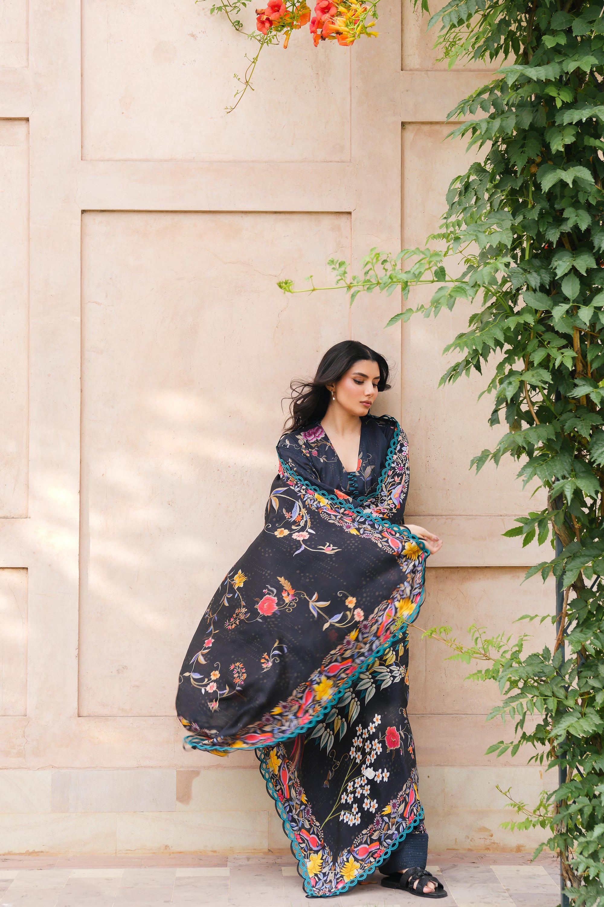A striking black lawn suit featuring intricate floral and bird motifs, paired with a medium silk dupatta for a graceful finish. Accentuated with vibrant turquoise cutwork, this design effortlessly blends bold charm with timeless elegance.
