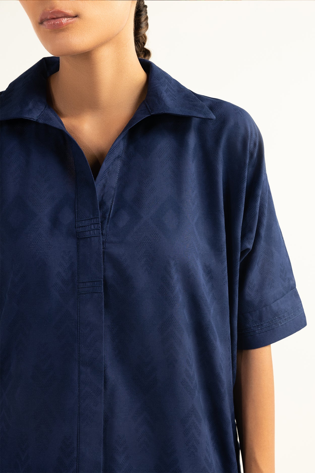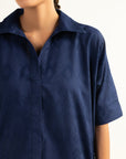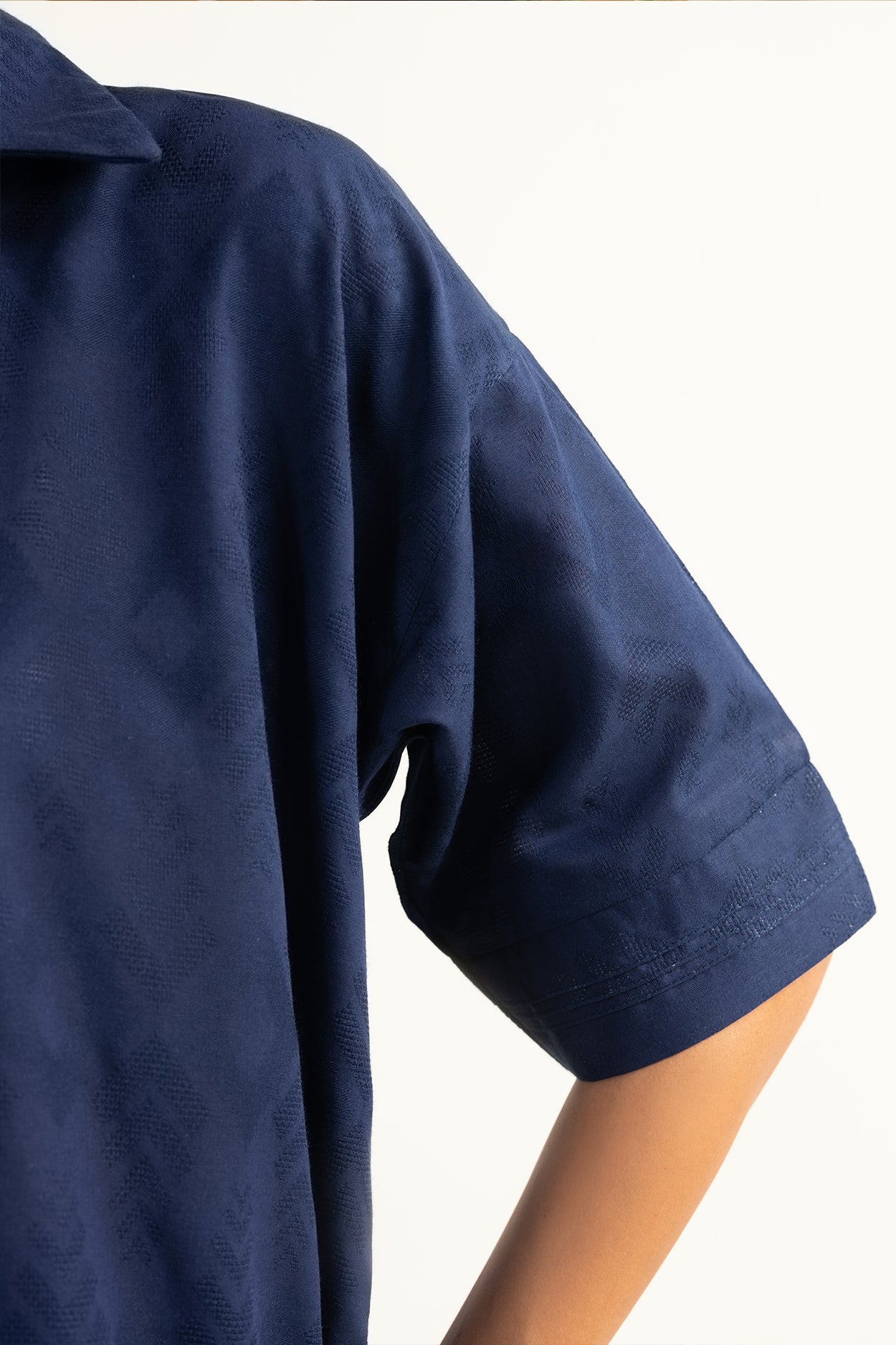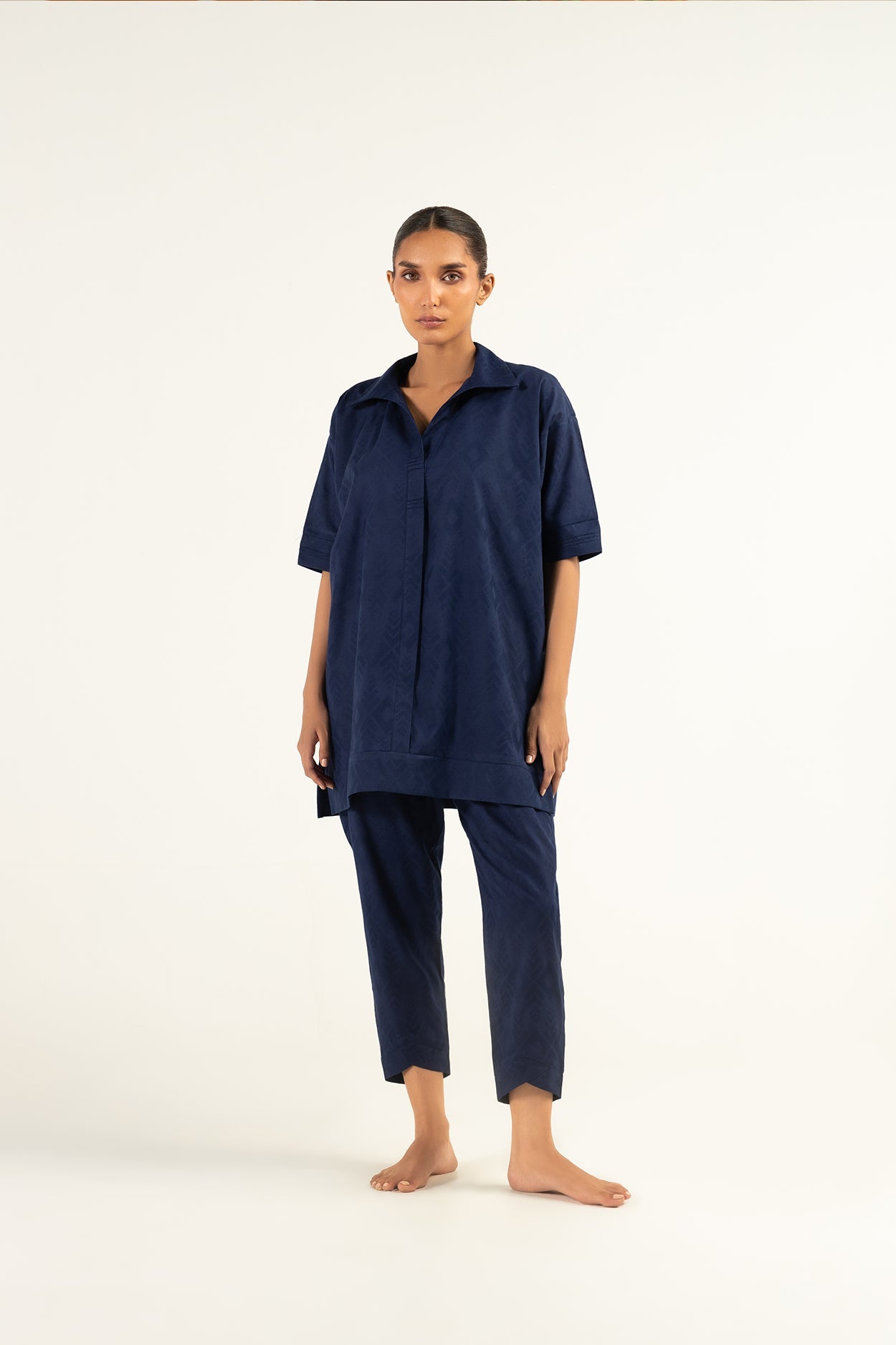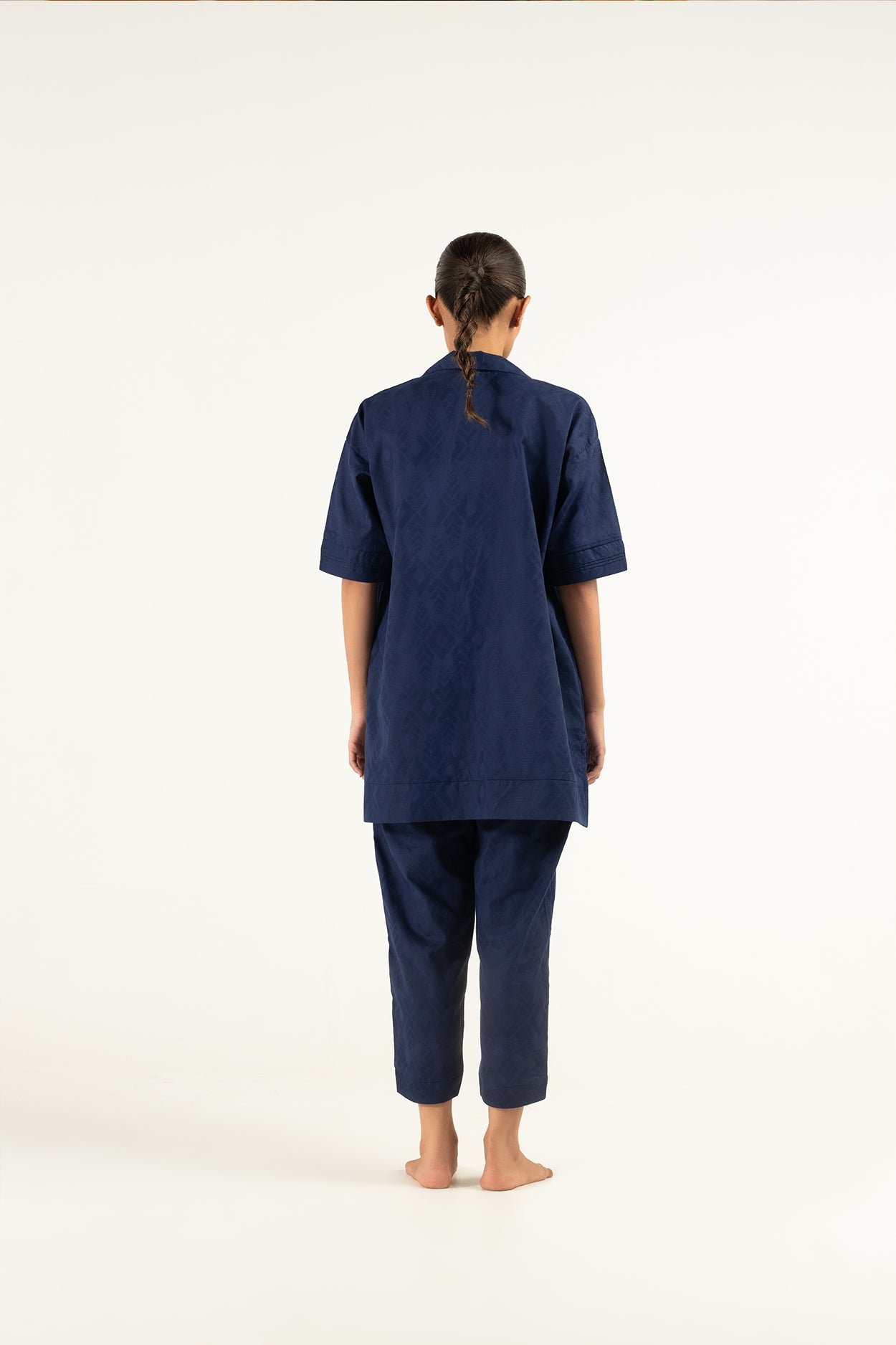 A minimal navy blue two piece set with a collared short-sleeve top and tapered trousers. Clean, smart, and effortlessly wearable for everyday comfort.