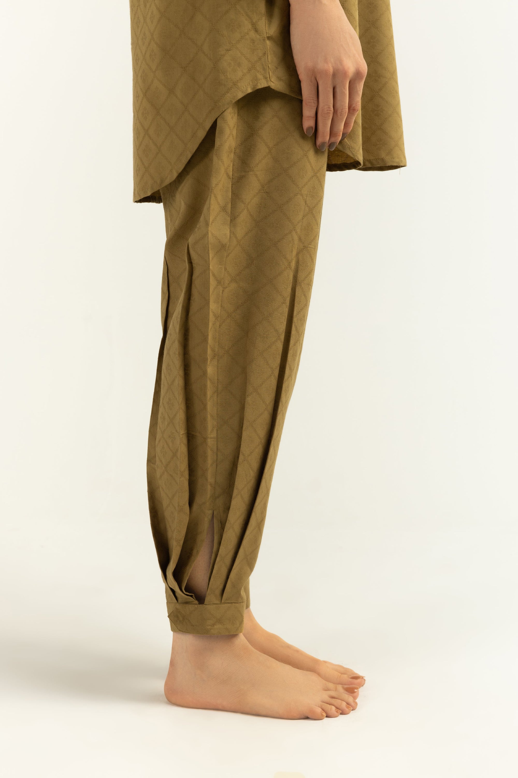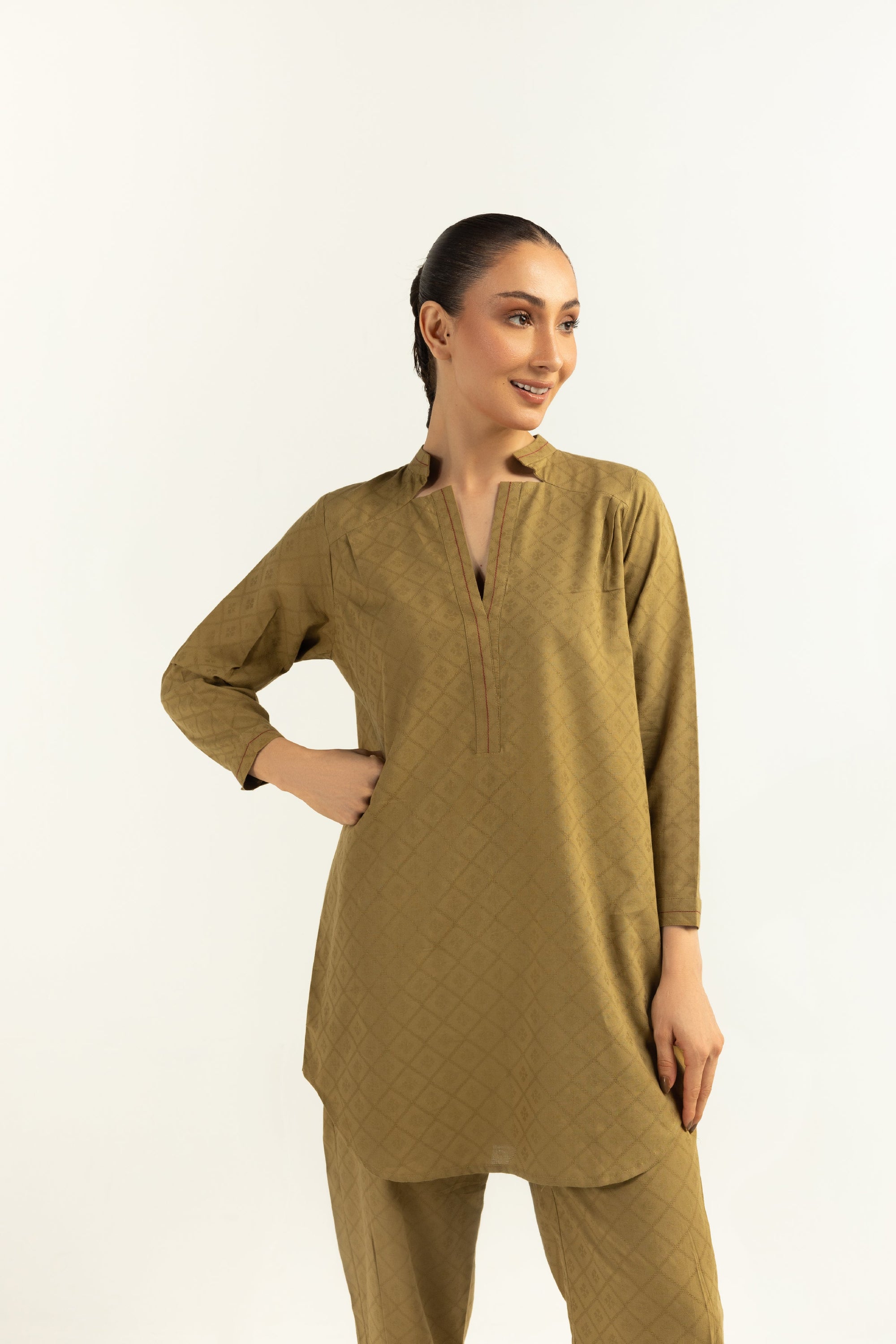 An earthy olive co-ord set featuring a long kurta with a band collar and relaxed fit, complemented by a subtle self-pattern. Paired with tapered trousers, this outfit is perfect for minimal everyday wear.