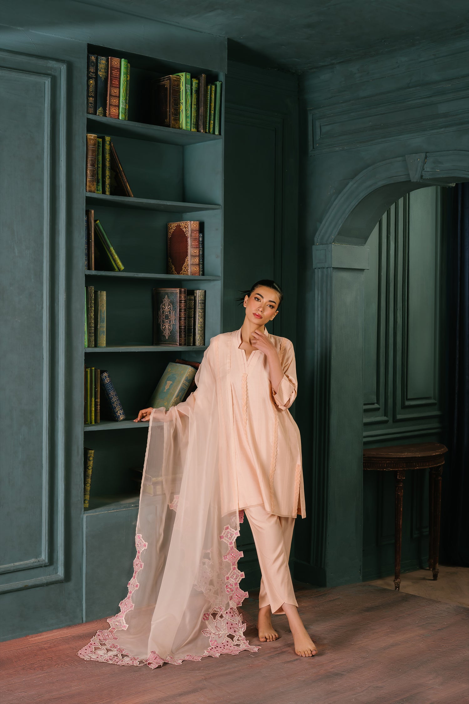A blush-toned ensemble that whispers timeless elegance. The minimal silhouette is elevated with delicate detailing and a sheer organza dupatta edged in soft pink floral embroidery. Perfect for garden brunches, Eid festivities, or when you simply want to glow in subtle sophistication.