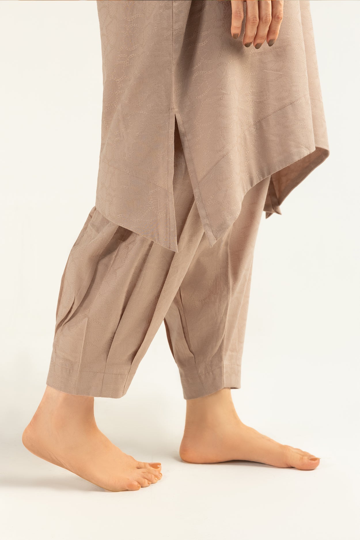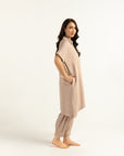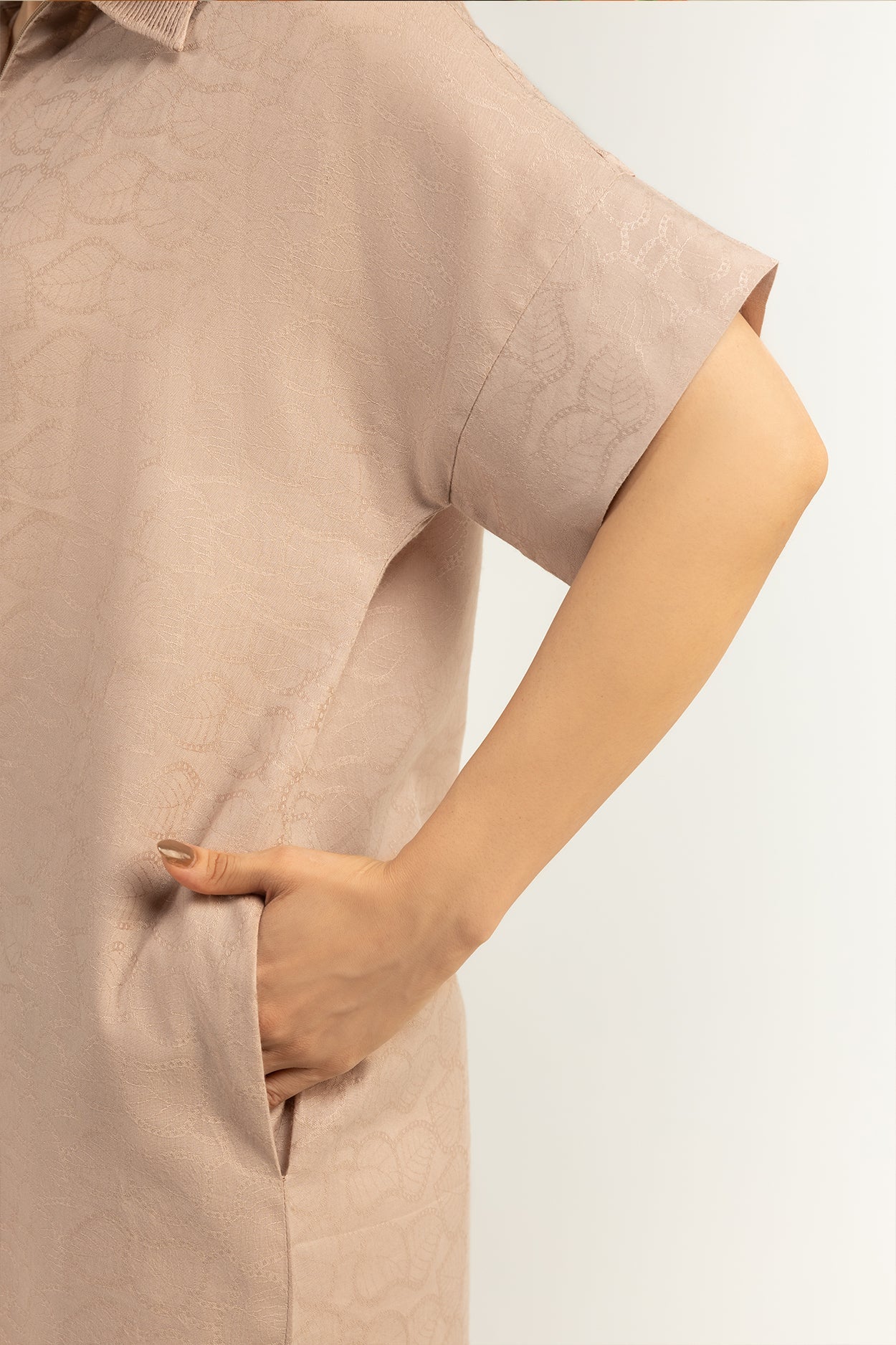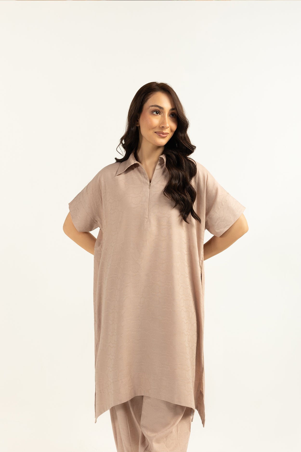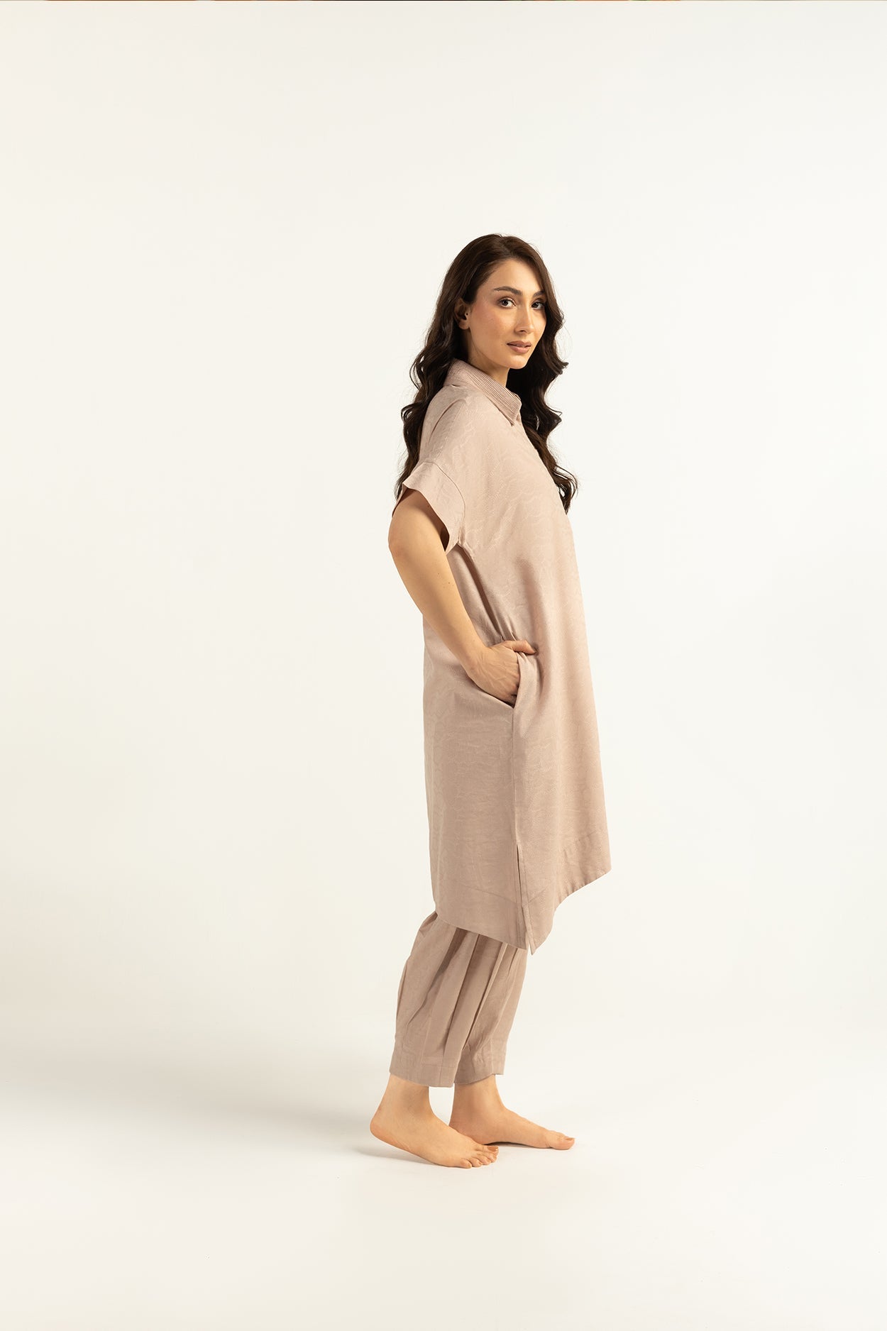 A light taupe two piece set featuring a short sleeved collared shirt with a relaxed fit, paired with matching loose trousers. A clean and minimal everyday look.