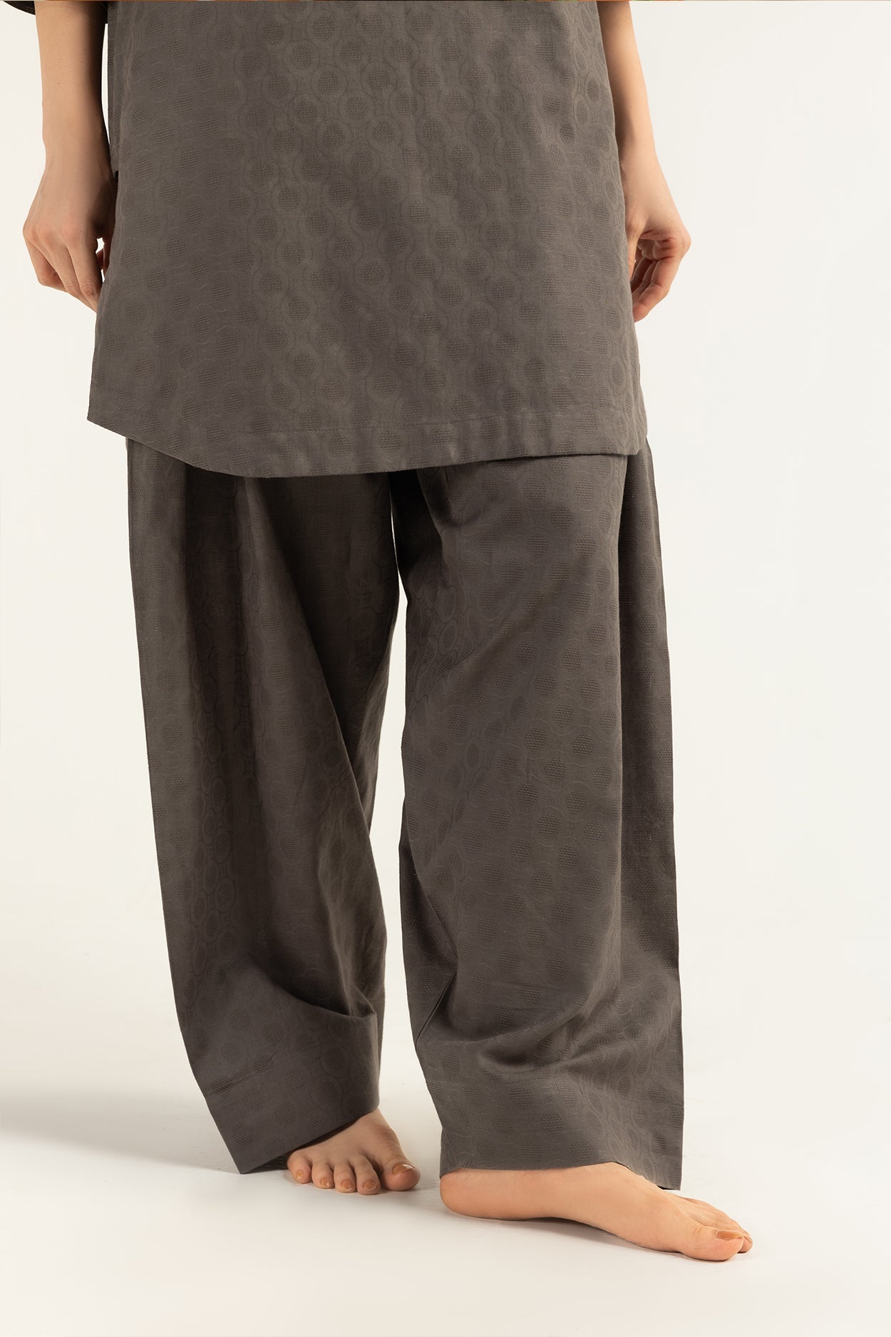 A charcoal grey two piece set with a straight cut shirt featuring a round neckline and a short front placket. Paired with matching straight pants.