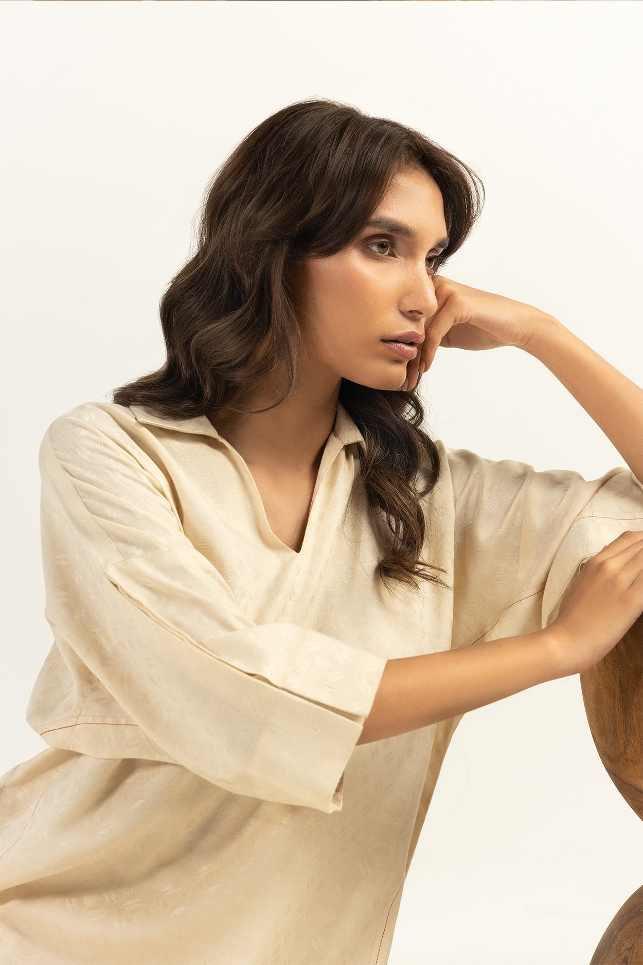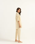 A beige two-piece set featuring a loose fit shirt with elbow length sleeves and a soft V neckline. Paired with matching tapered pants.