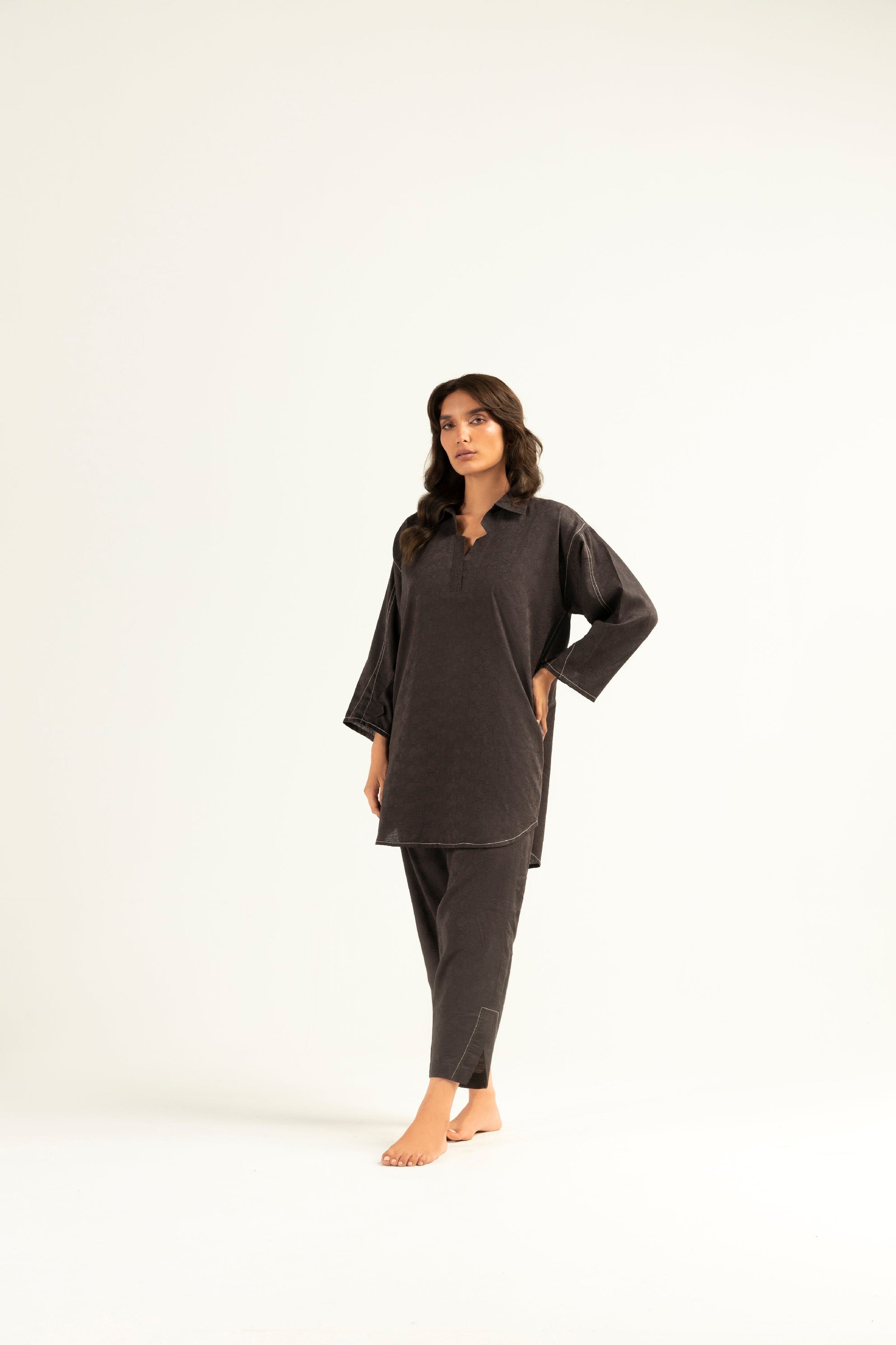 A charcoal black co-ord set made on cotton jacquard fabric. The kurta features a round hem, V-slit neckline with a collar, and loose full sleeves. It’s paired with straight pants that have stitch detailing on the hem.